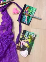18+ only! Item includes the one piece lingerie body suit worn during my Daphne photoshoot and five signed high res, glossy 4x6s featuring the lingerie. Photos feature nudityy. Bodysuit is crotchless. Please note at checkout if you’d like the photos personalized with your name.