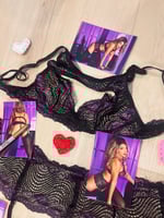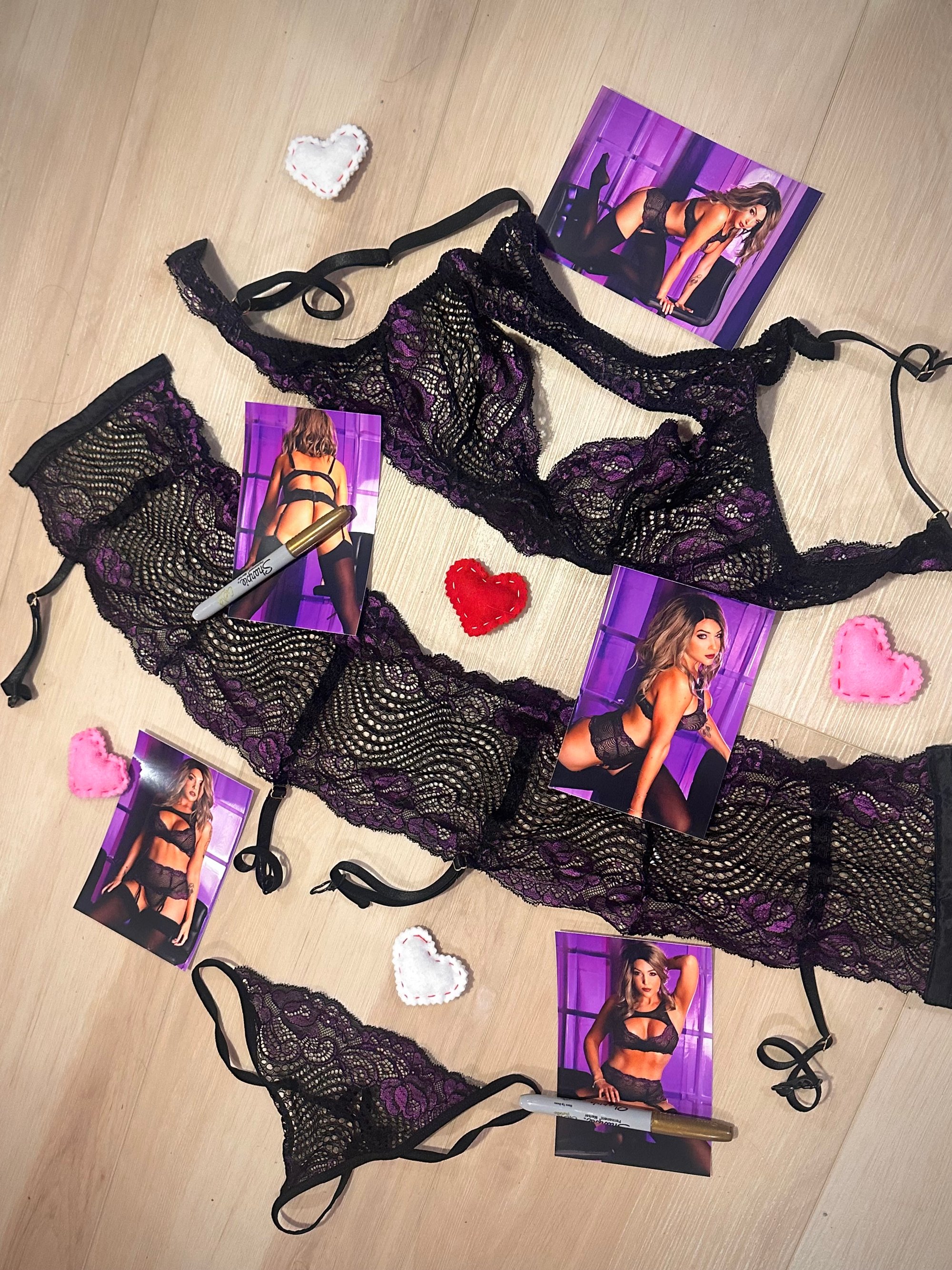 18+ only! Item includes a three piece lingerie set worn during a photoshoot and five signed high res, glossy 4x6s featuring the lingerie. Two photos feature nudityy. Please note at checkout if you’d like the photos personalized with your name.