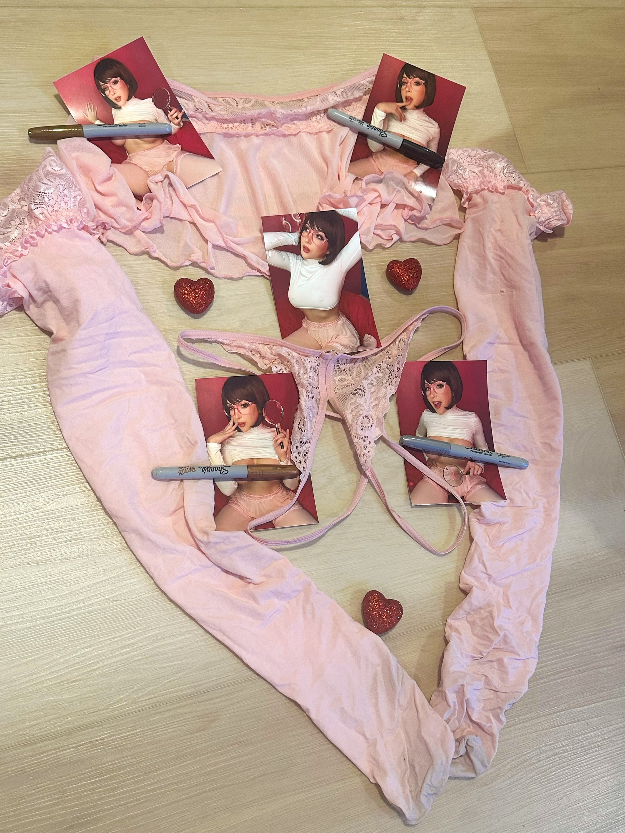 18+ only! Worn two piece lingerie and thigh highs from my Valentine’s Velma photoshoot and video and five signed high res, glossy 4x6s photos. Photos feature t0pless and frontal nudittyy. Please note at checkout if you’d like the photos personalized.